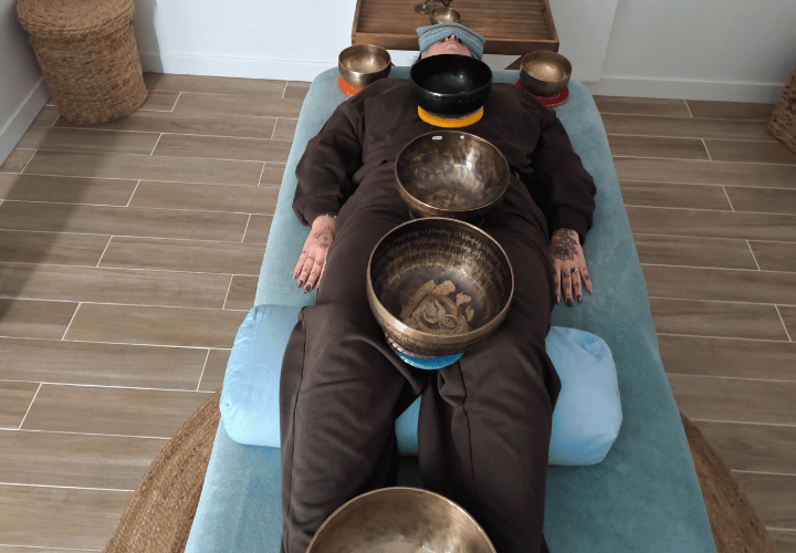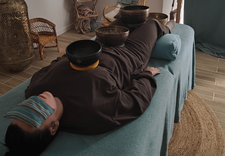 Certains bols sont délicatement posés sur ton corps – sur ton dos, ta poitrine ou tes membres – créant un massage vibratoire qui traverse tes tissus en profondeur. D’autres résonnent autour de toi, t’enveloppant dans un cocon sonore apaisant. Chaque bol chantant, accordé sur une fréquence spécifique correspondant aux différents chakras, agit en synergie pour libérer les tensions accumulées dans ton corps et apaiser ton mental agité.